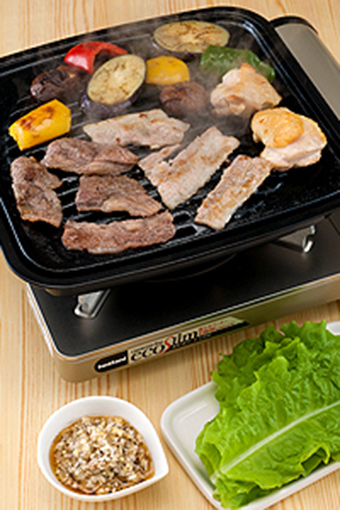 加热烤肉架,烧烤纸上涂薄薄一层油,待油浸透纸张后,将猪肉、牛肉和鸡肉、菜椒、茄子和香菇放在纸上烤。烤熟后放在准备好的莴苣上,用步骤2的调料根据个人喜好依量添加卷着吃即可。